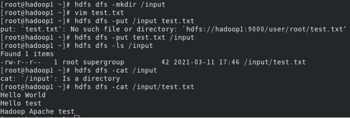 在hdfs web端查看该文件,在web端点击Utilities中的Browse the file system,点击input可以看到test.txt
