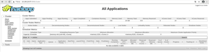 查看Yarn页面,浏览器输入访问http://10.100.20.97:8088
