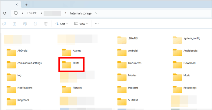 步骤 3 :打开手机的内部存储,然后找到并打开存储图片的 DCIM 文件夹。