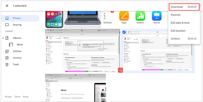 在电脑上访问 Google Photos 网站,并使用同一个 Google 帐户登录。选择从Android上传的照片 > 点击三点图标 > 点击**"下载"**即可将它们下载到Windows电脑上。
