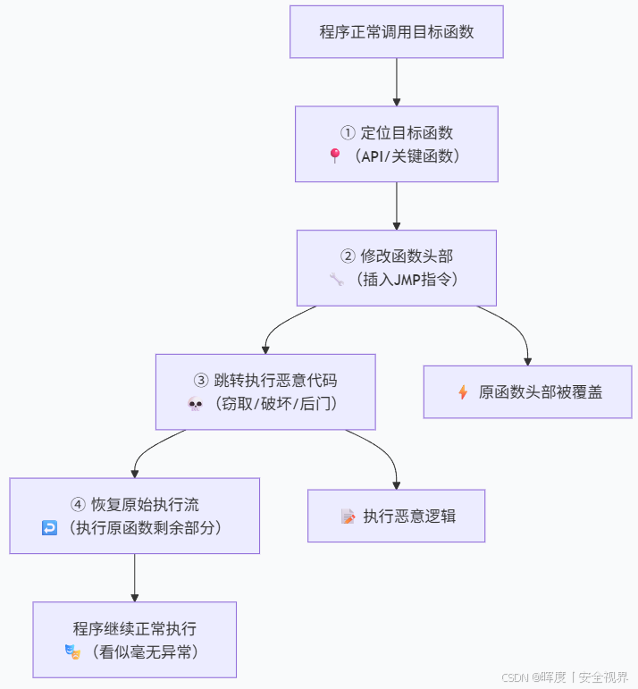 核心思想 :在合法函数中插入隐秘"跳板" ,在执行原始功能前先暗中执行恶意代码。