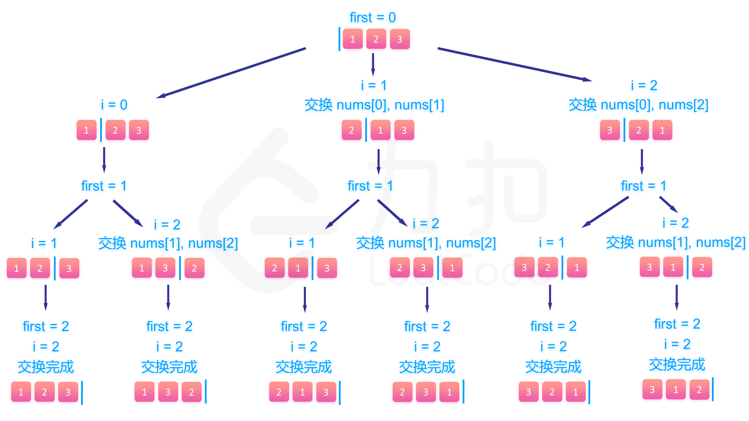 假设已经填到第 first 个位置,那么 nums 数组中 [0,first−1] 是已填过的数的集合,[first,n−1] 是待填的数的集合。尝试用 [first,n−1] 里的数去填第 first 个数,假设待填的数的下标为 i,那么填完以后我们将第 i 个数和第 first 个数交换,即能使得在填第 first+1 个数的时候 nums 数组的 [0,first] 部分为已填过的数,[first+1,n−1] 为待填的数,回溯的时候交换回来即能完成撤销操作。