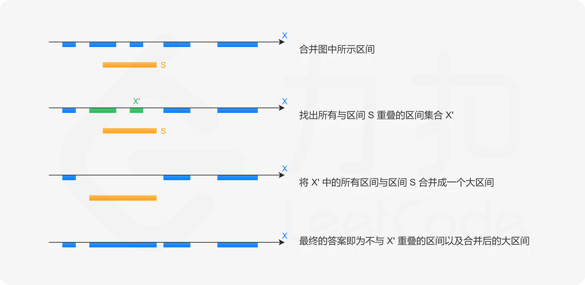 最终的答案即为不与 X ′重叠的区间以及合并后的大区间。