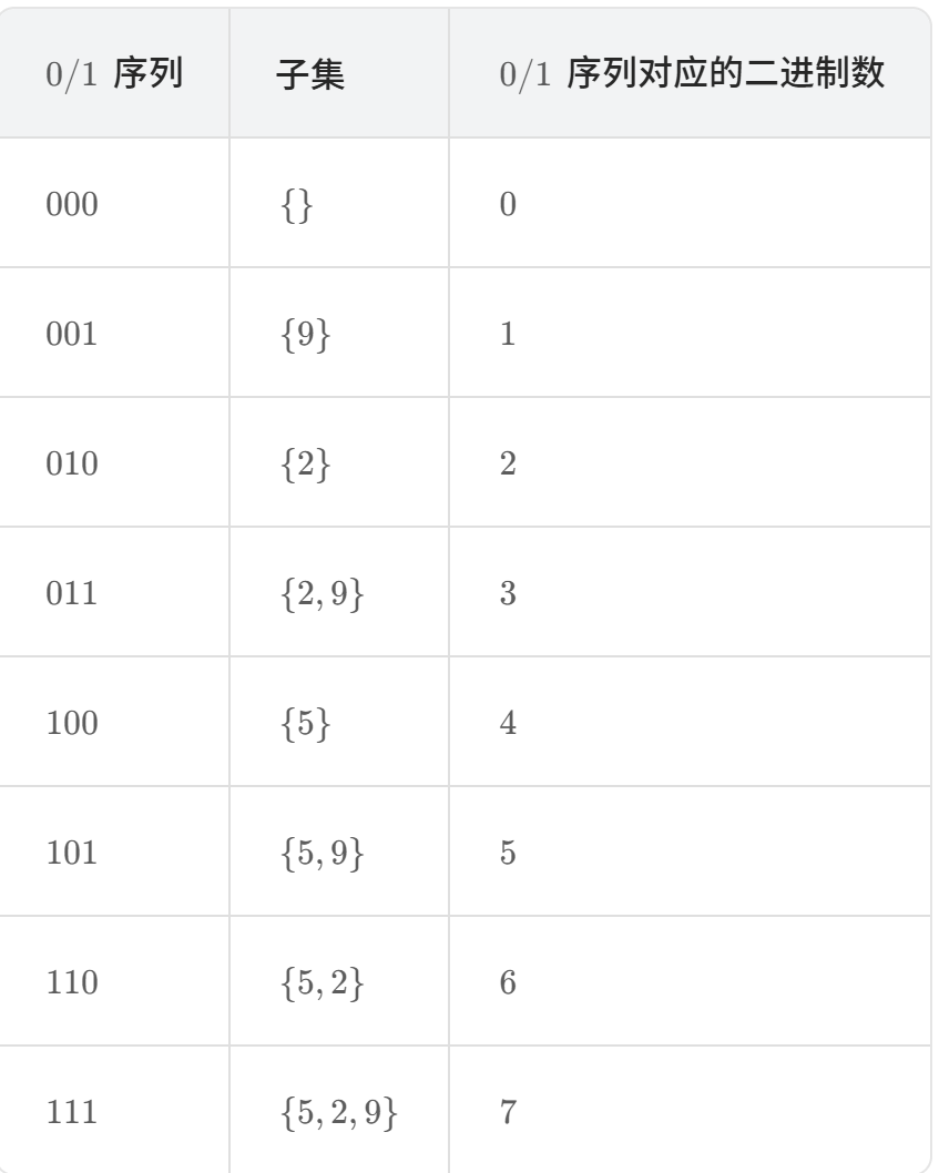 记原序列中元素的总数为 n。原序列中的每个数字 ai的状态可能有两种,即「在子集中」和「不在子集中」。用 1 表示「在子集中」,0 表示不在子集中,那么每一个子集可以对应一个长度为 n 的 0/1 序列,第 i 位表示 ai是否在子集中。例如,n=3 ,a={5,2,9} 时: