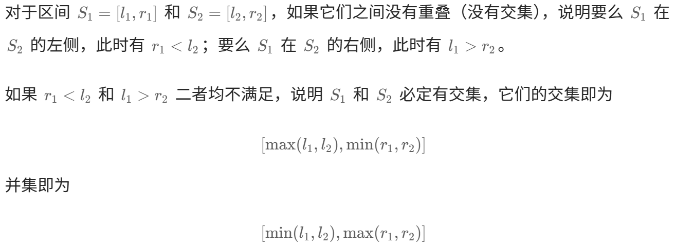 如果上面两种情况均不满足,说明 [l i,r i] 与 S 重叠,无需将 [li,ri] 加入答案。此时,需要将 S 与 [li,ri] 合并,即将 S 更新为其与 [li,ri] 的并集。