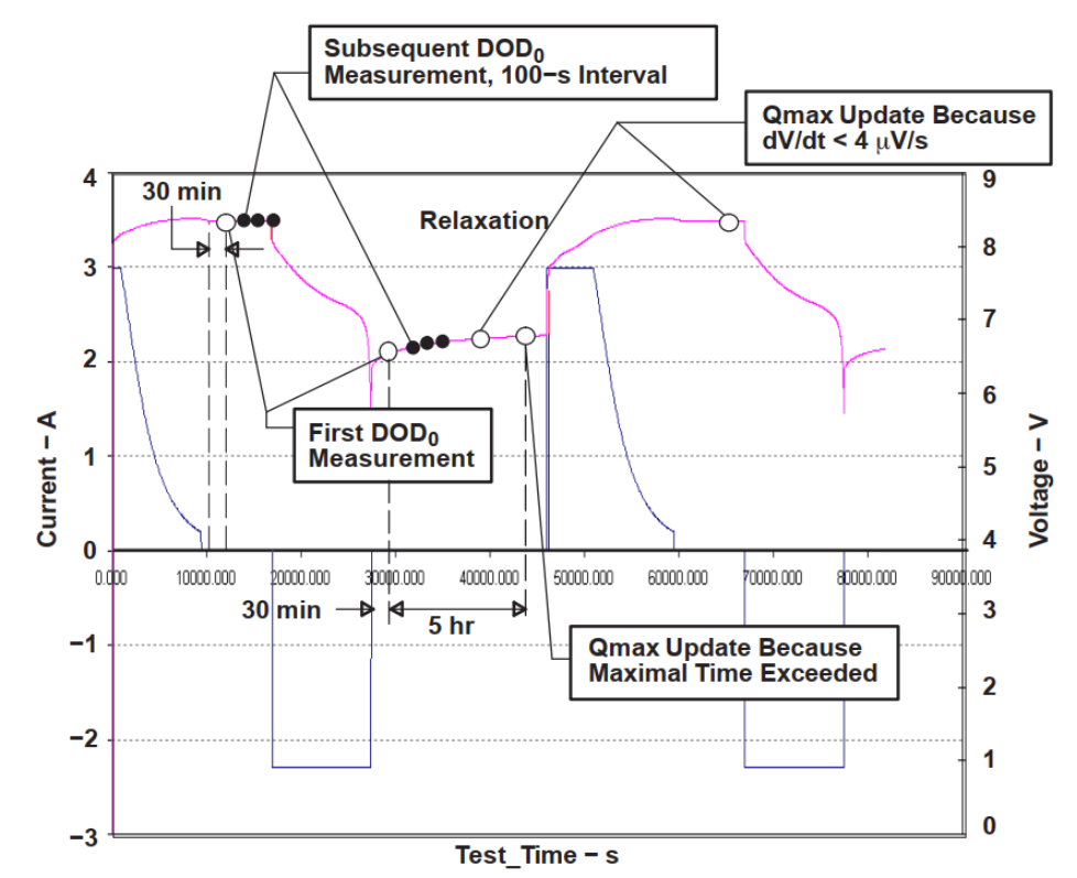 当OCV电压足够稳定,或者静置超过5小时,则更新得到DOD可以用于更新Qmax;比如,当静置时获得合格的 DOD 更新,记为 DOD1;然 后开始放电,累积放出电荷 PassedCharge;然后静置,获得合格的 DOD 更新, 记为 DOD2。