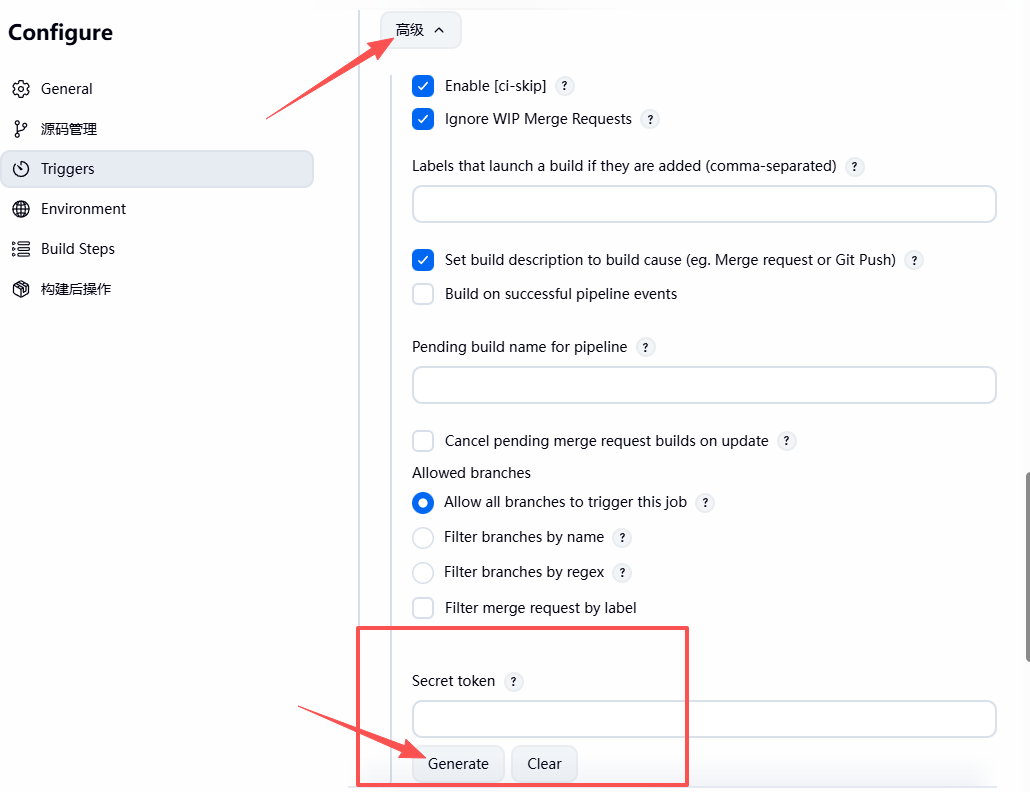 往下翻,找到高级------Secret token------点击Generate,这个后续用于 GitLab 进行 Webhook 配置