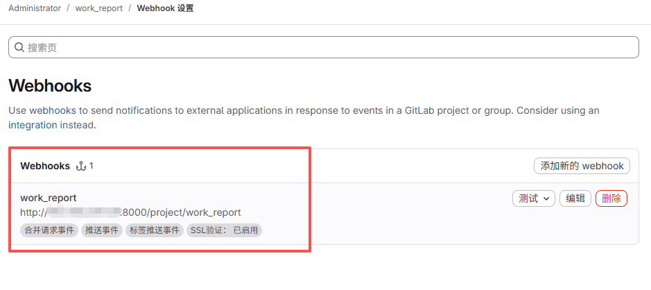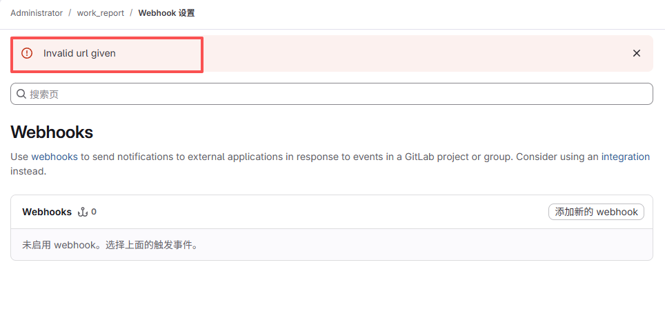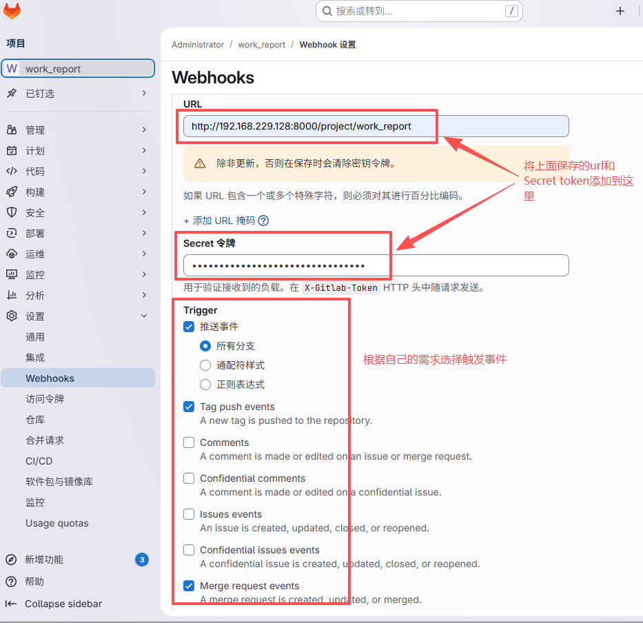 - 打开在gitlab创建的项目work_report------设置------Webhooks------添加新的webhook