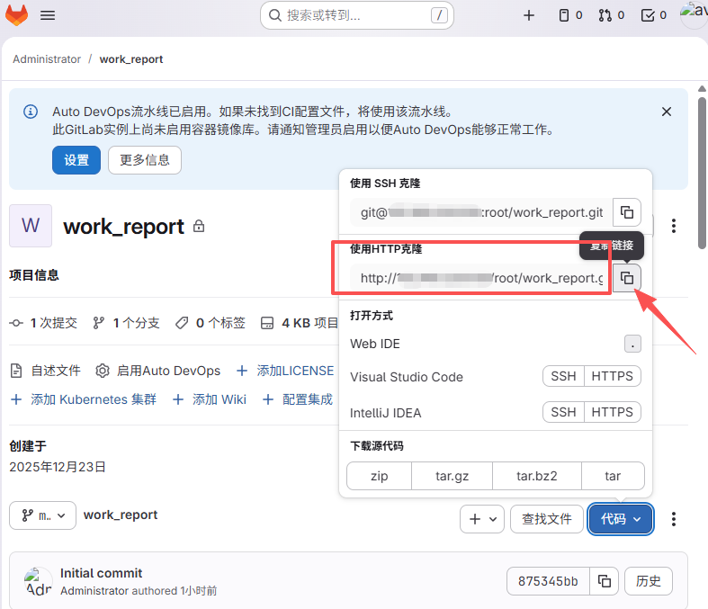 - 打开我们创建的git项目,复制HTTP链接,注意这个链接是不带端口的,因为默认是80端口,可以不写,但是我们创建Gitlab时自己定义了端口为8001,后续使用时,需要把8001端口加上