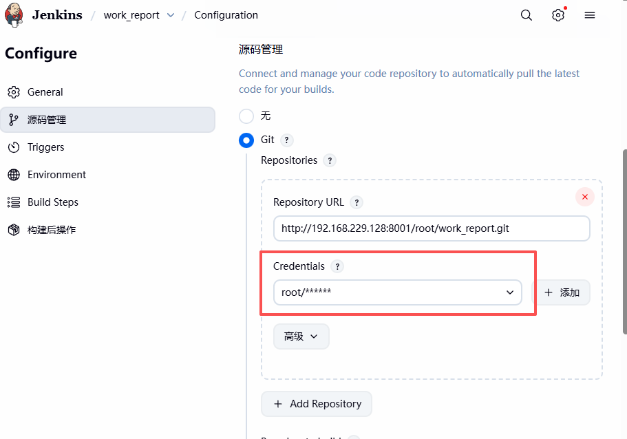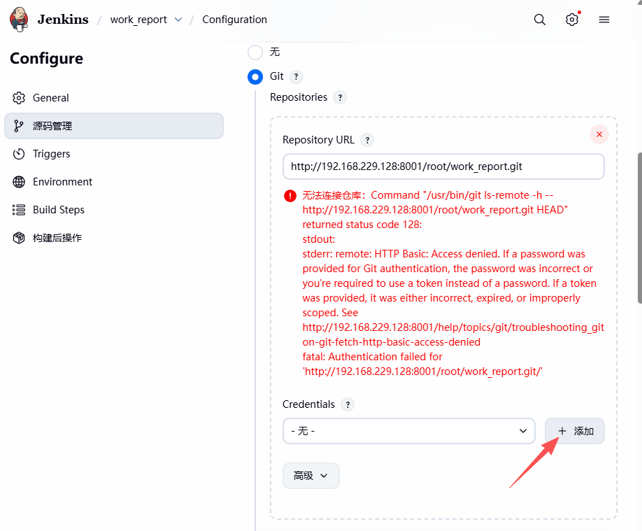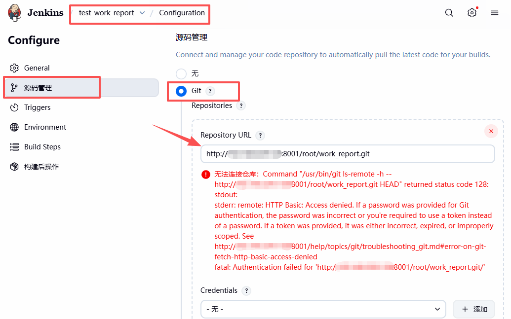 - 回到jenkins创建的项目:点击配置------源码管理------选择Git,将我们刚刚复制的git链接添加8001端口复制进去,此时报错。因为我们还没有配置Gitlab的登录凭证,下面介绍两种解决方法,可自行选择。