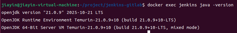 输出类似 openjdk version "21.0.9" 的信息,确认 JDK 存在。所以在 "JDK" 部分,你可以完全忽略或留空。如果 Jenkins 任务(如 Maven 项目)要求关联 JDK,直接选择 "java"(系统默认 Java)即可