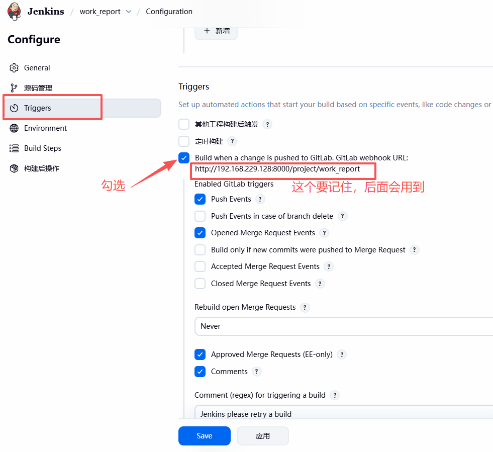 找到Triggers触发器,勾选Build when a change is pushed to GitLab