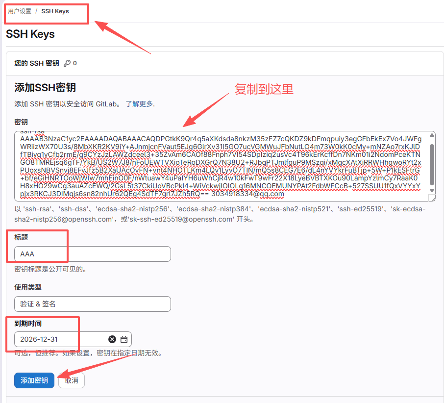 粘贴到gitlab中,位置:用户设置------SSH Keys