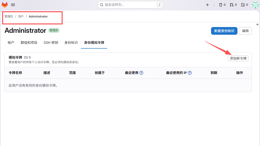进入到Gitllab管理区------用户------Administrator------身份模拟令牌------添加新令牌