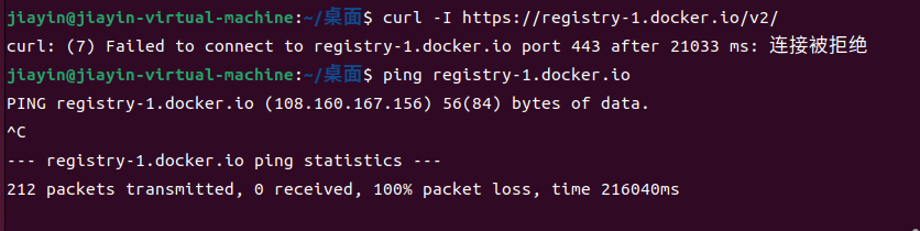 - 尝试docker pull hello-world拉取镜像测试,发现无法拉取,检查网络连接,发现网络不通