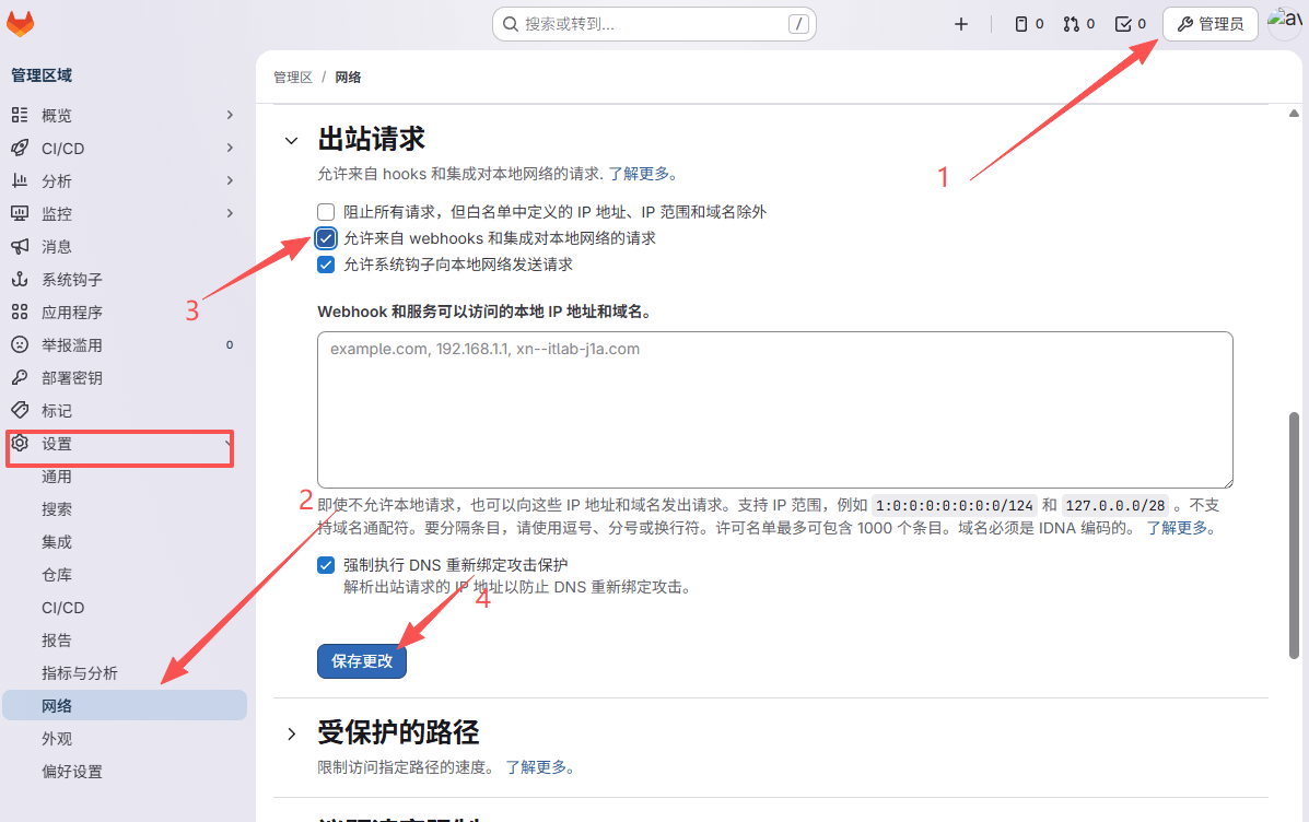 点击管理员------设置------网络------出站请求------勾选允许来自 webhooks 和集成对本地网络的请求------保存