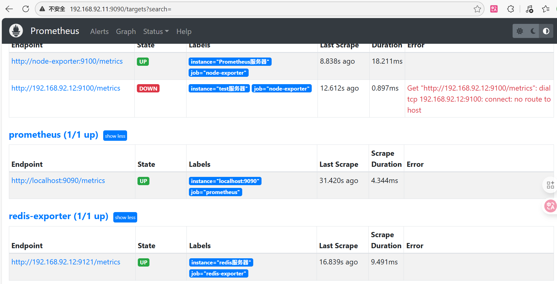 刷新访问http://192.168.92.11:9090/targets?search=,确认新监控的redis服务器是否生效