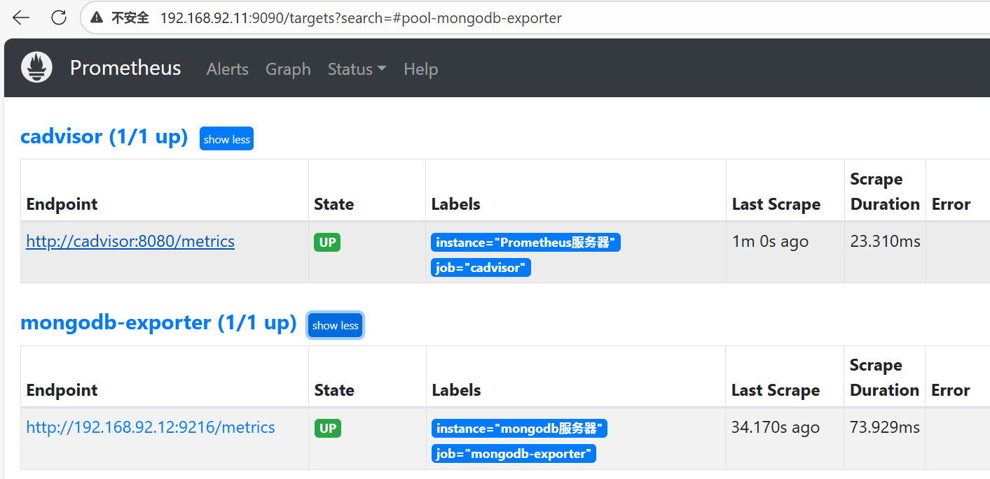 刷新访问http://192.168.92.11:9090/targets?search=,确认新监控的mongodb服务器是否生效