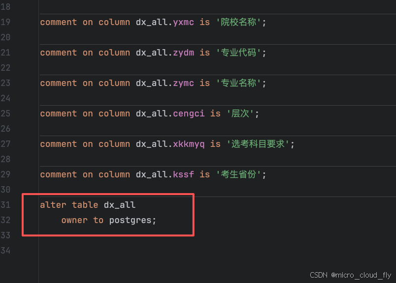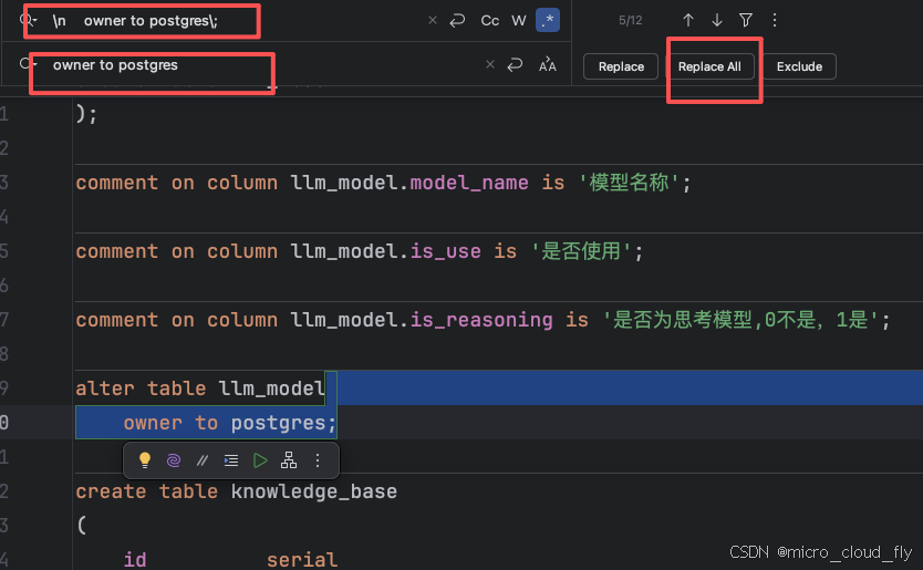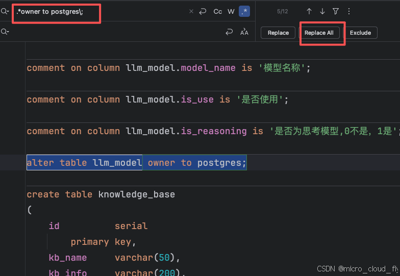 第二步,把包含 owner to postgres;的所有行替换为空行