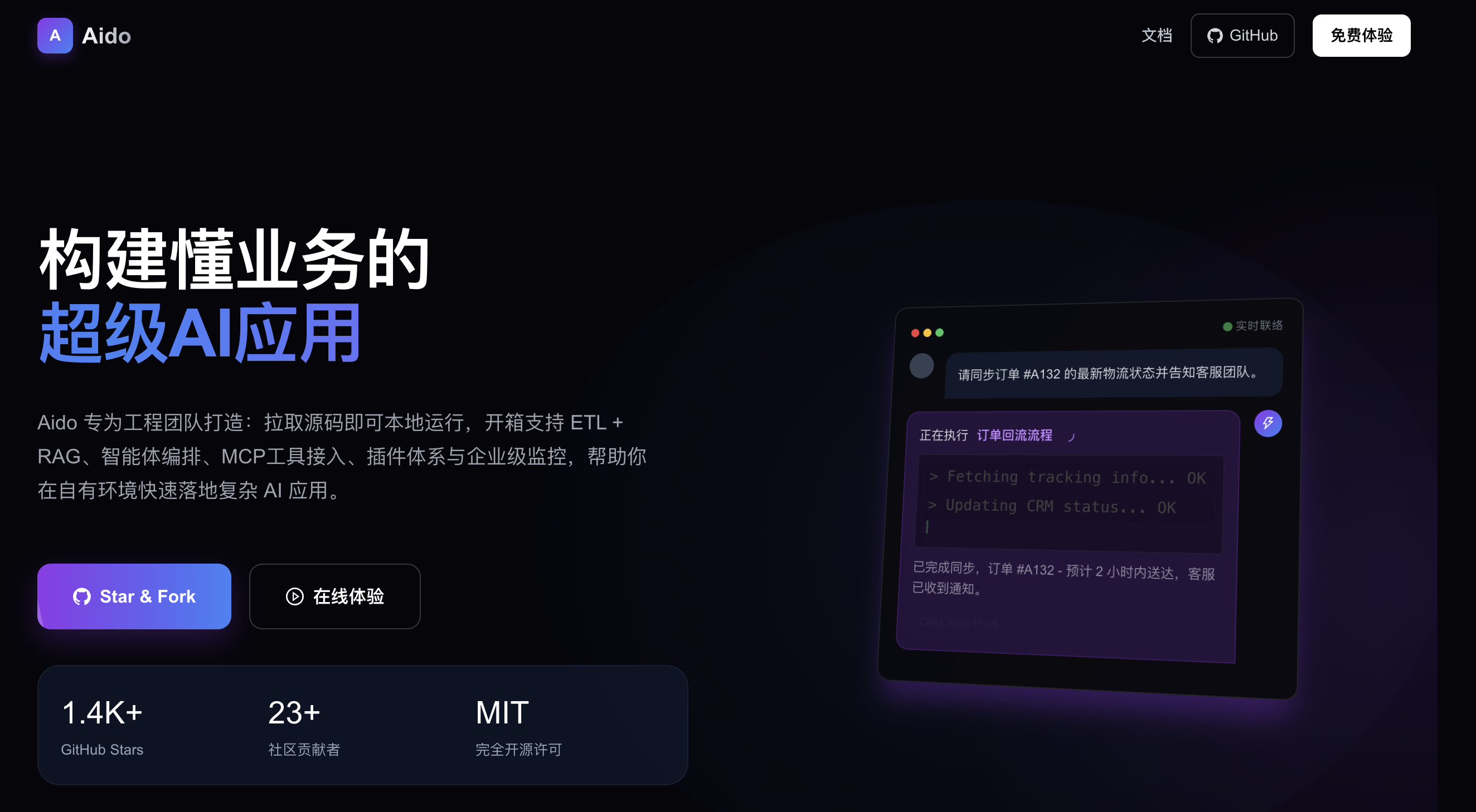 Aido 专为工程团队打造:拉取源码即可本地运行,开箱支持 ETL + RAG、智能体编排、MCP工具接入、插件体系与企业级监控,帮助你在自有环境快速落地复杂 AI 应用。