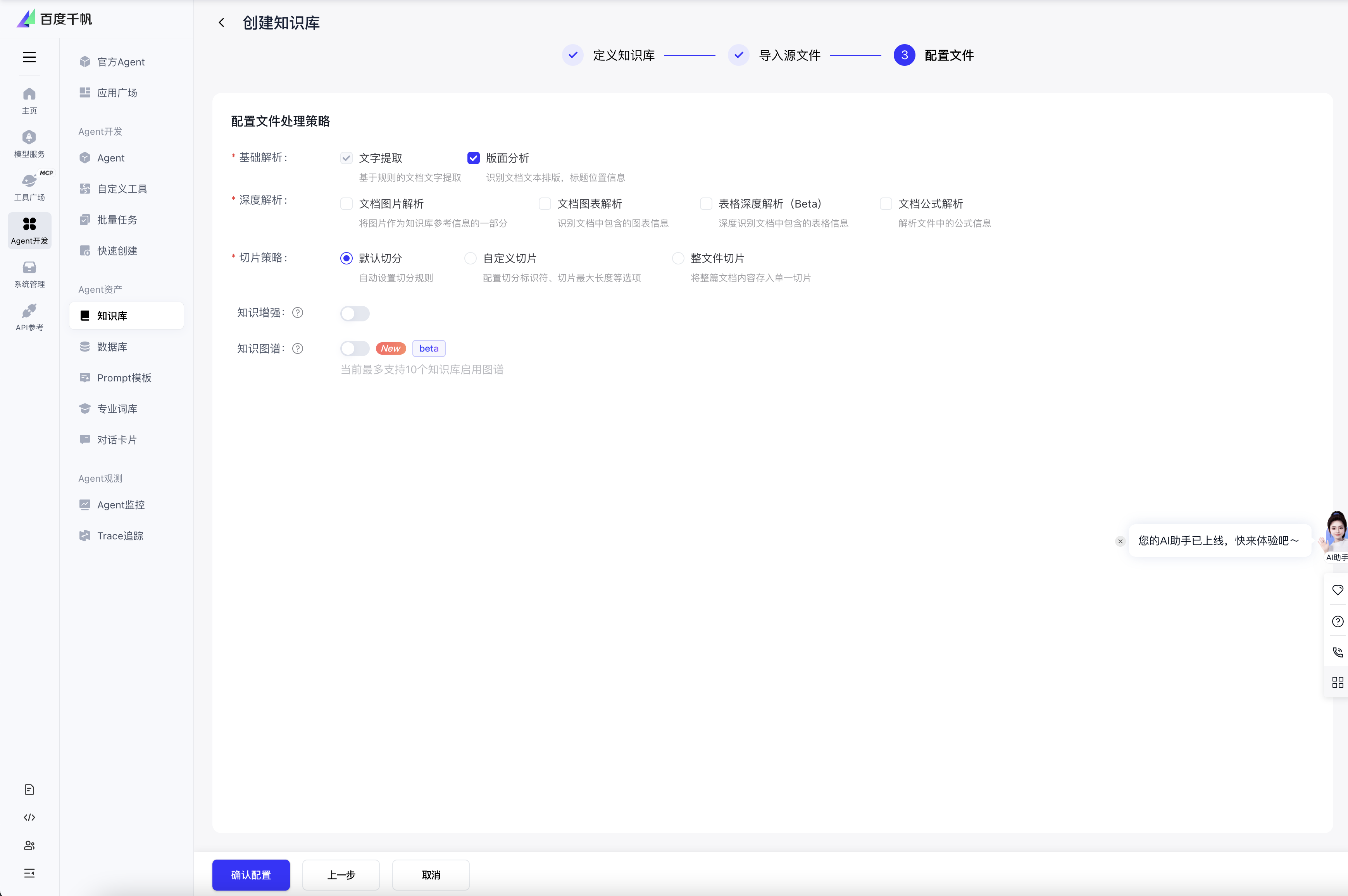 切片策略选择默认切分,系统会自动设置切分规则。同时开启知识增强,选择增强方式。