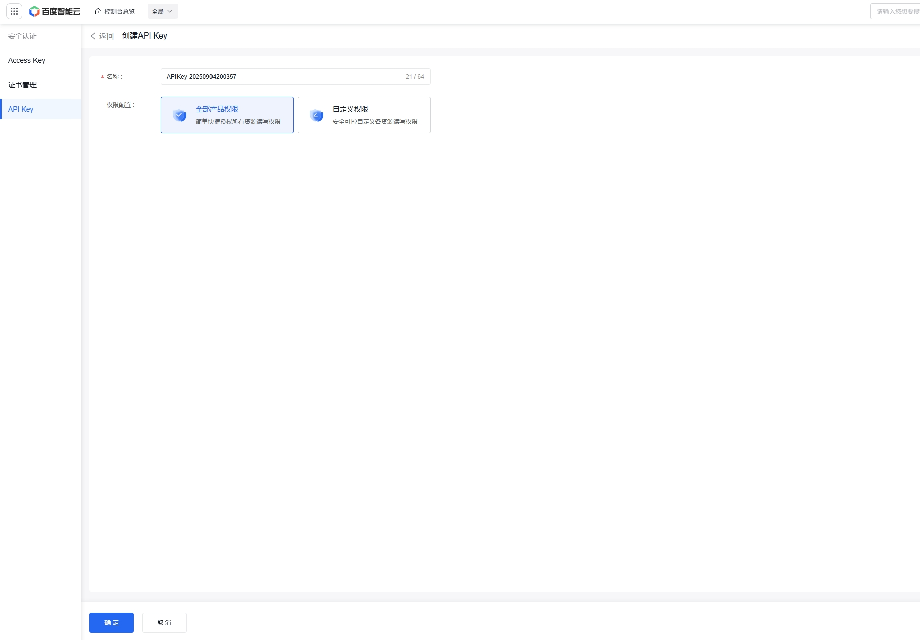 点击 "创建 API Key" 按钮,页面将跳转至创建页面。在该页面中,您可按照要求填入相应的名称,并在 "权限配置" 一栏,选择 "全部产品权限" 选项,相关操作界面可参照下图内容。