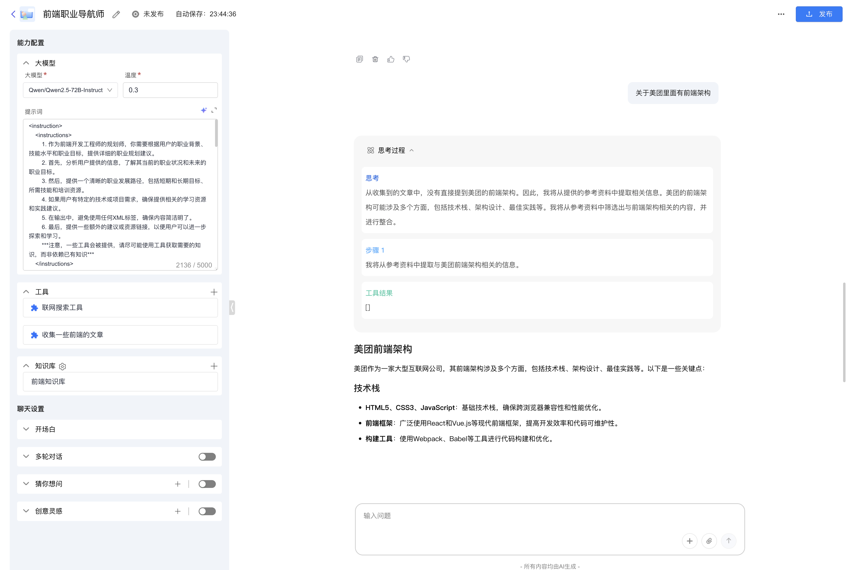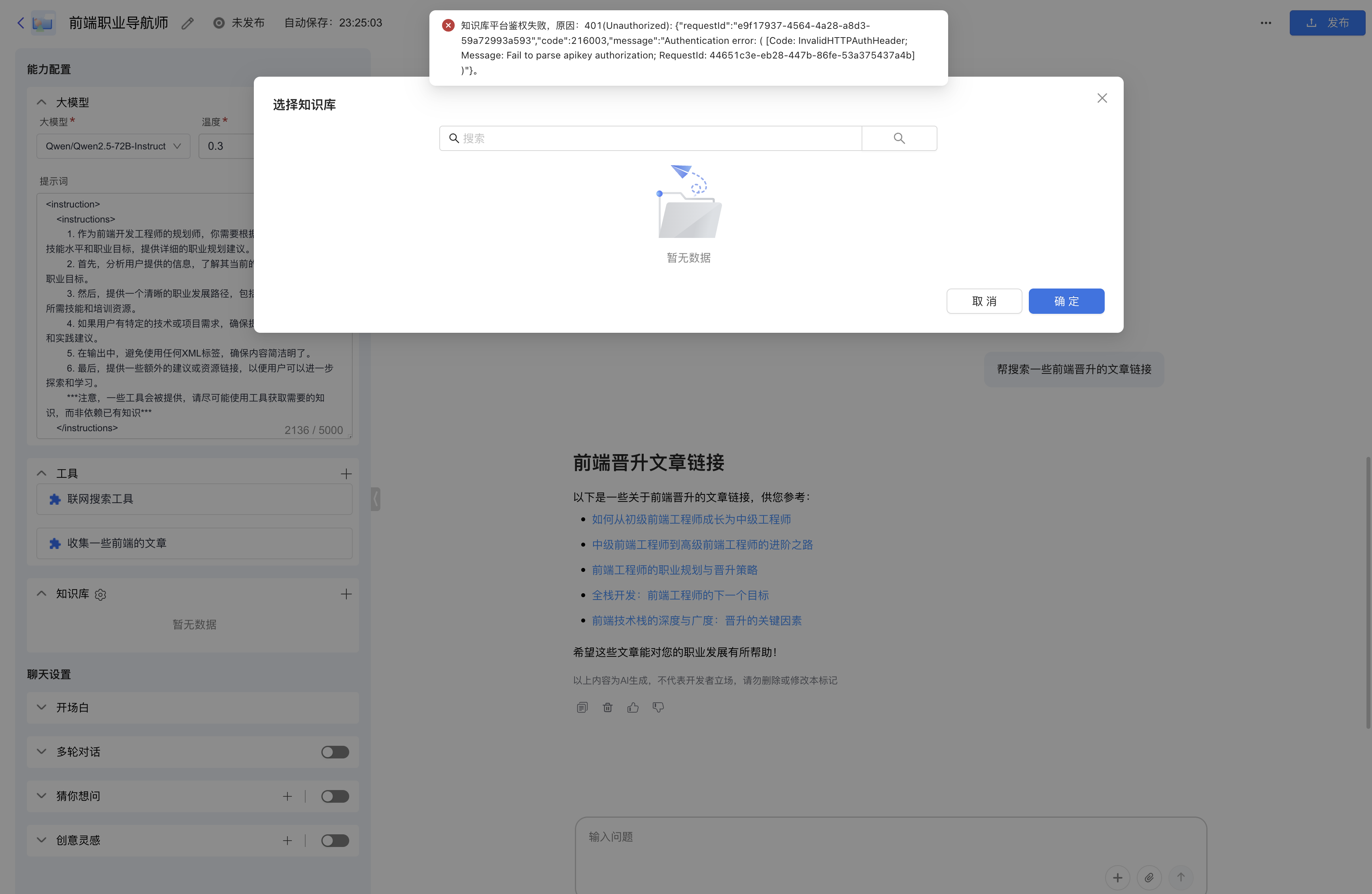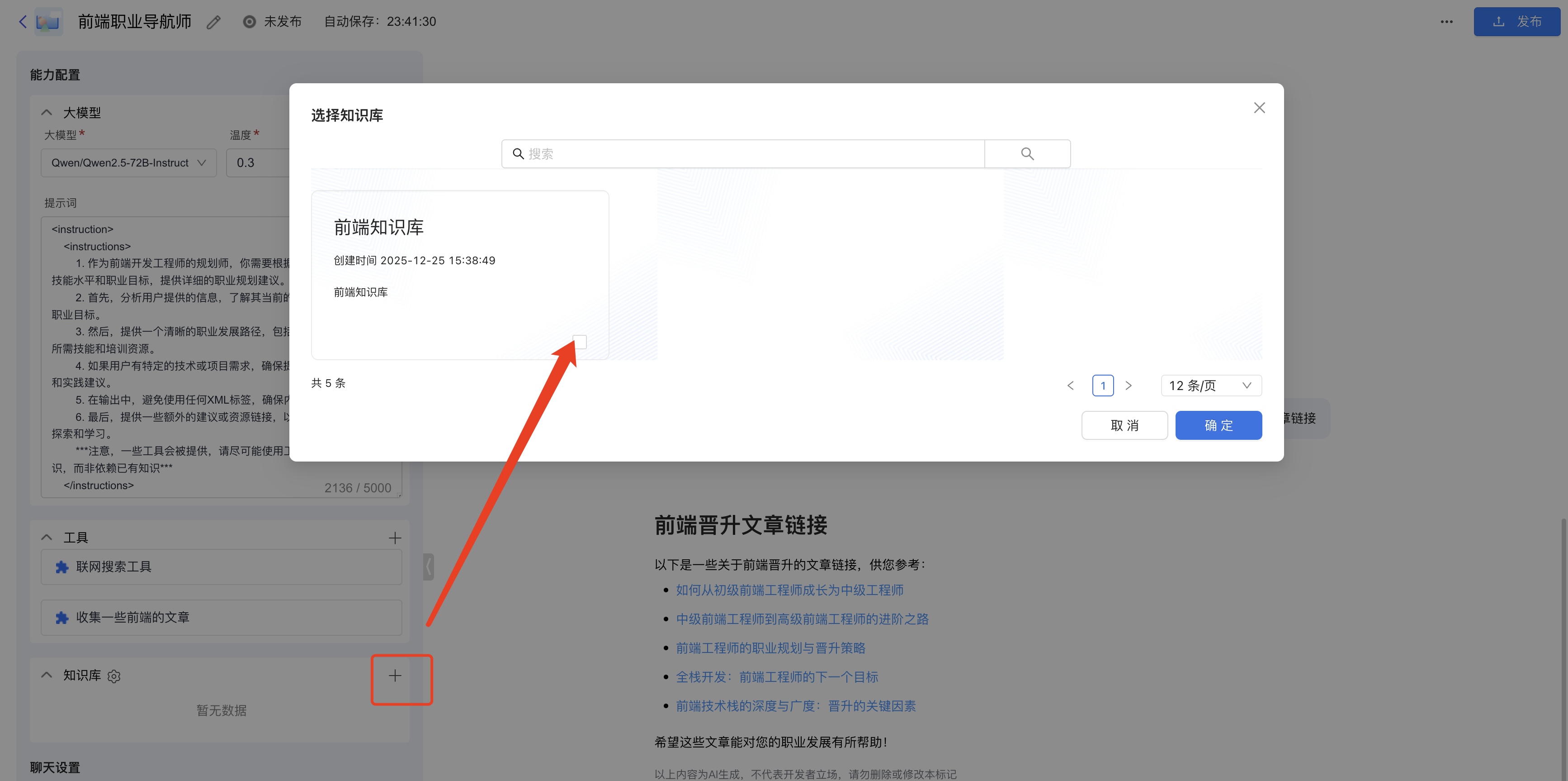 创建、测试完成后,即可在Agent应用界面选择对应的群组内的知识库使用