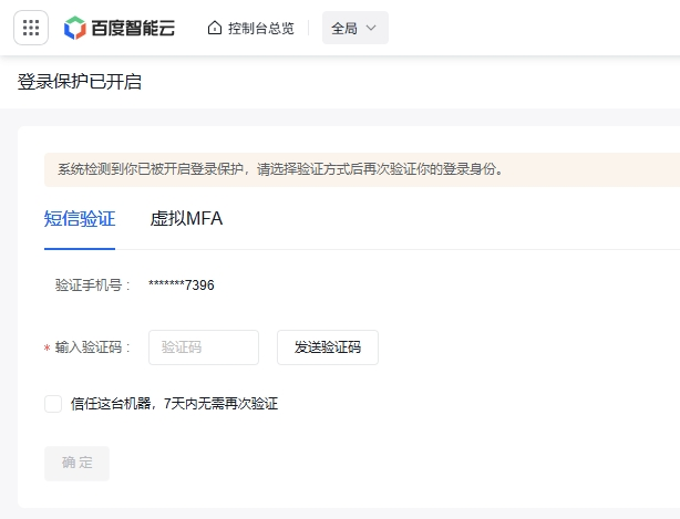 在登录页面,输入您的手机号和验证码。成功登录后,系统将引导您进入百度智能云的登录保护环节,此时需要您再次对相关信息予以验证,具体验证界面可参考下图展示内容。