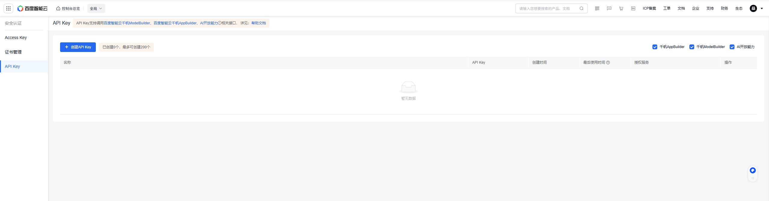 进入官网首页后,在页面左侧的侧边栏中,找到 "API Key" 一栏并点击进入,在此页面您能够查看 API Key 的相关信息。需要注意的是,若您是首次进入该页面,API Key 栏显示为空,此时则需要您手动进行创建,详情可参考下图。