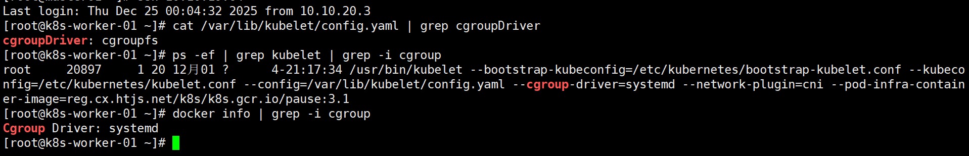 重启后,再次检查 kubelet 的 cgroup 驱动是否统一: