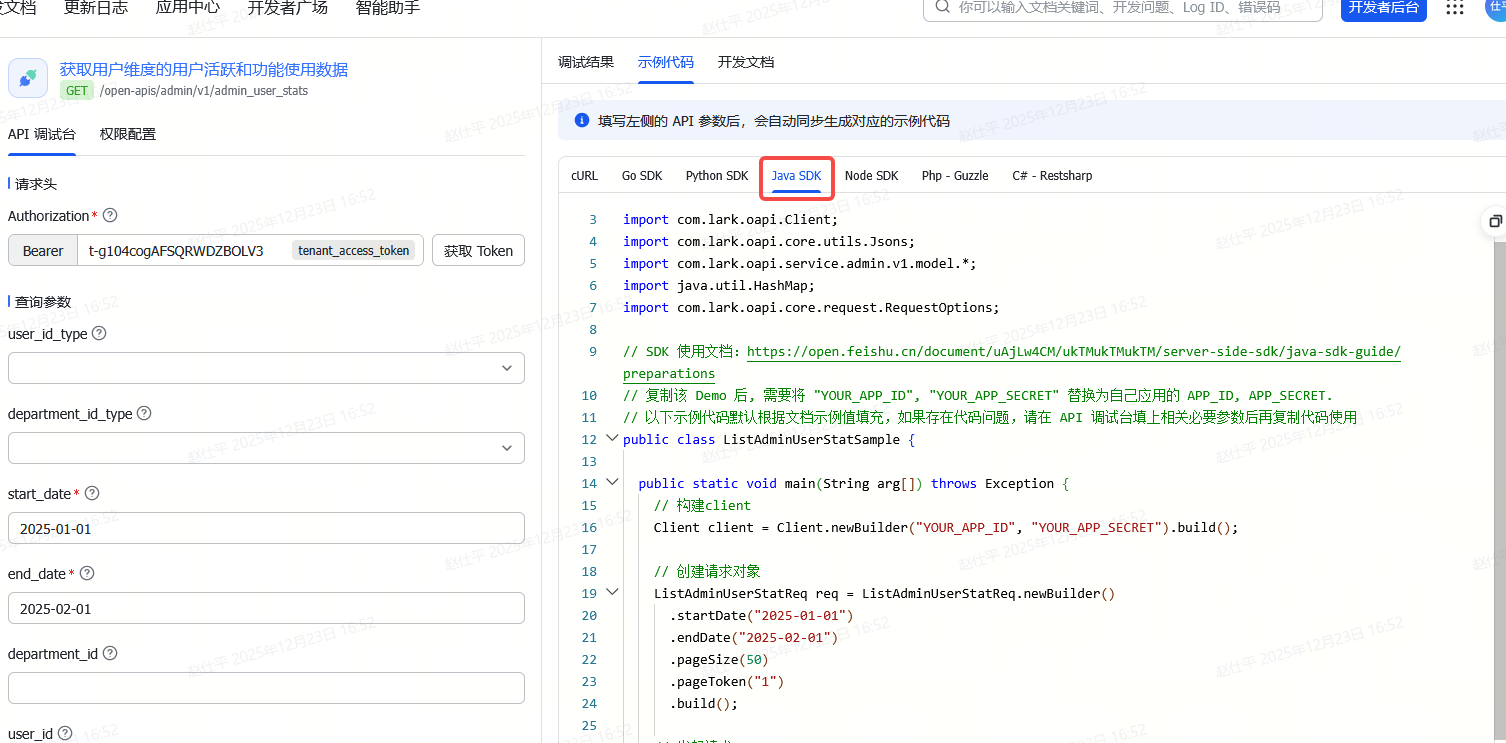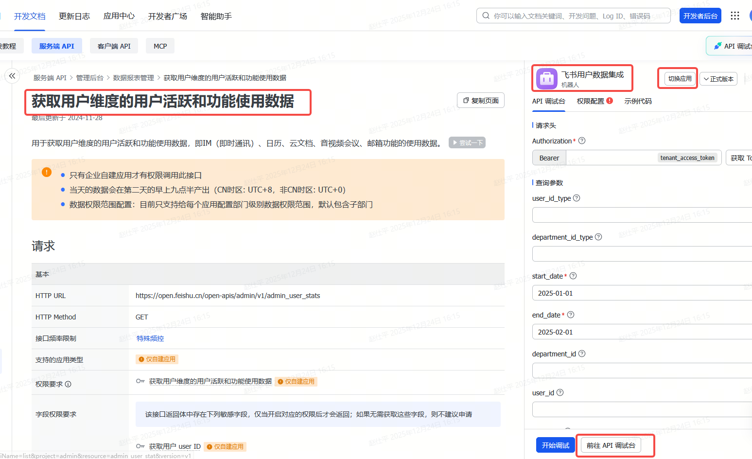 打开之前的《获取用户维度的用户活跃和功能使用数据》 ,点击右下角的"前往API调试台",要先注意"切换应用"和"权限配置"。麻烦的是权限设置需要应用发布,但也没事。