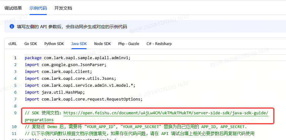 3.示例代码与依赖文档衔接友好,示例代码中有文档链接
