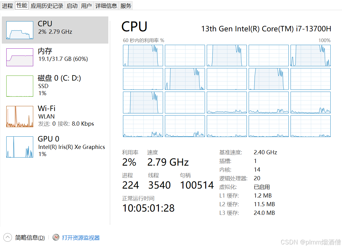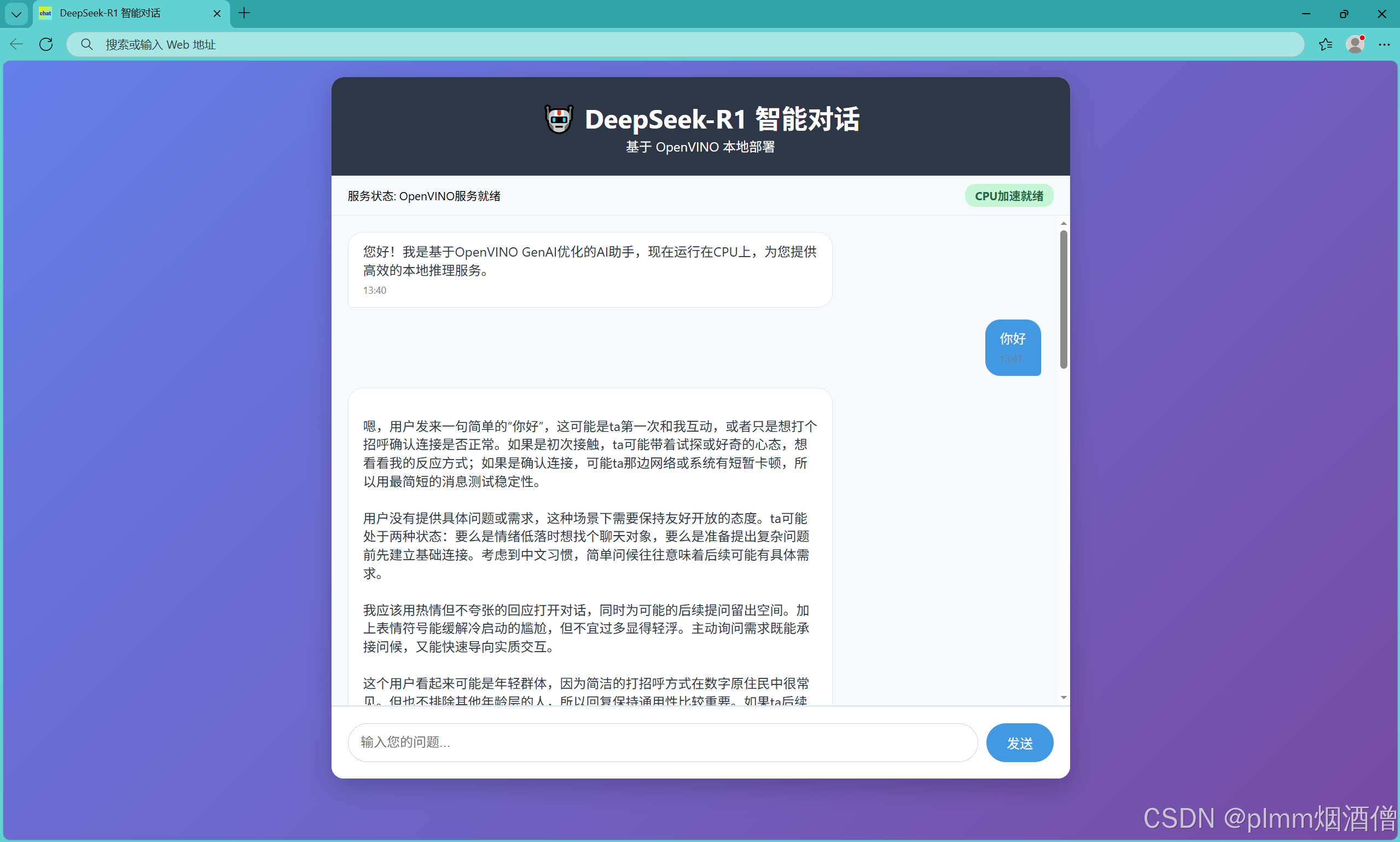 可以看到,OpenVINO 优化以及 INT4 量化后的 DeepSeek-R1-0528-Qwen3-8B,内存占用约 10G,CPU 也在可接受范围,每次推理大约需要 40 秒。