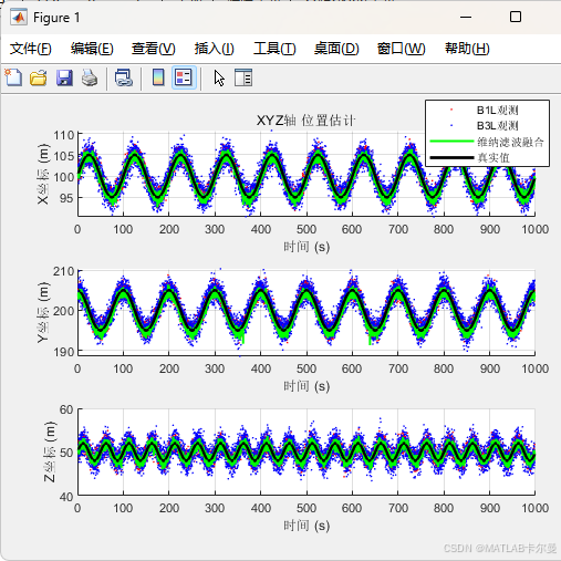 true_pos(1,:) = 100 + 5*sin(2*pi*0.01*t); % X坐标 (m)
