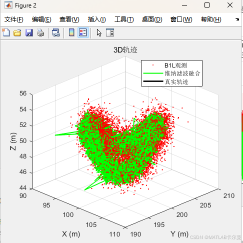- 设定了GNSS的频率( B 1 L B1L B1L和 B 3 L B3L B3L频段),仿真参数(如采样间隔、总时长等)以及真实轨迹的生成(通过正弦和余弦函数模拟了三维位置变化)。