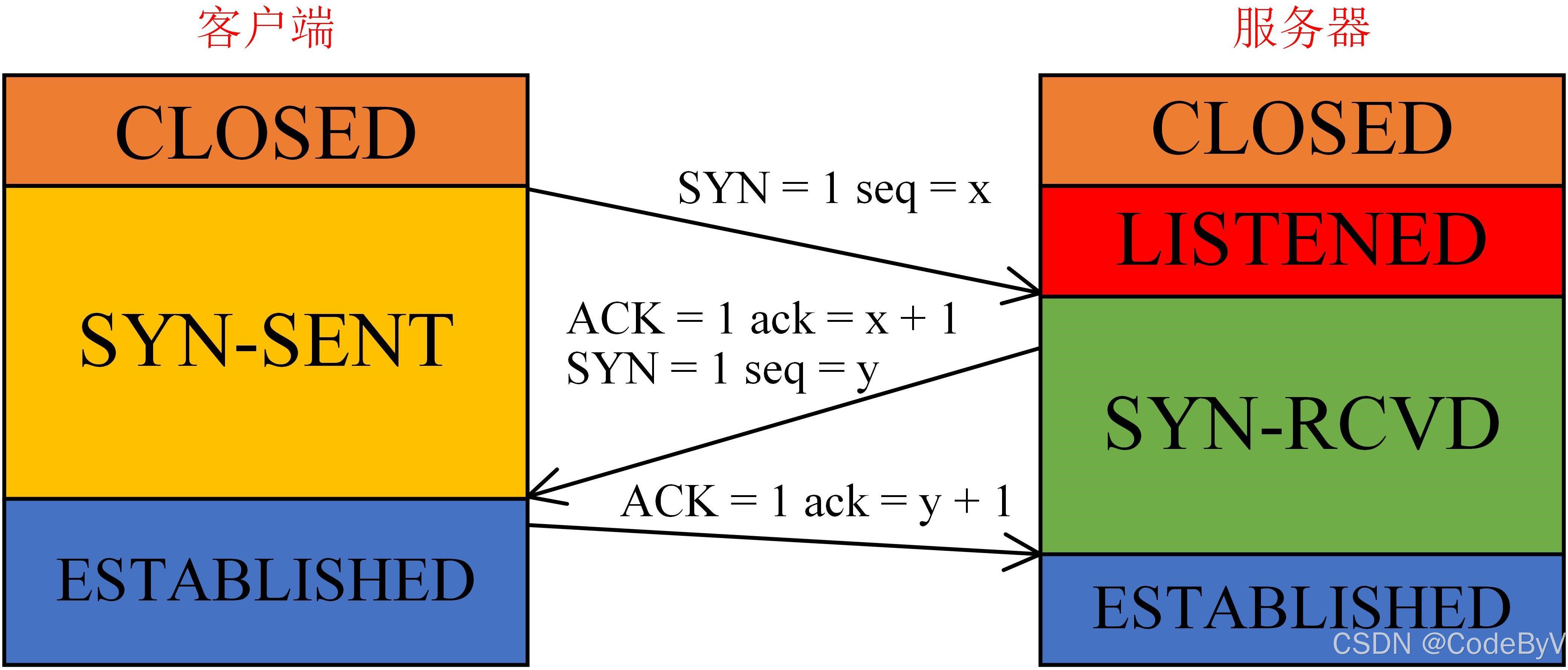 SYN标志位为1(同步报文段),携带初始序号(ISN)(如x); - 目的:客户端向服务器发起连接请求,告知服务器"我能发送数据"。