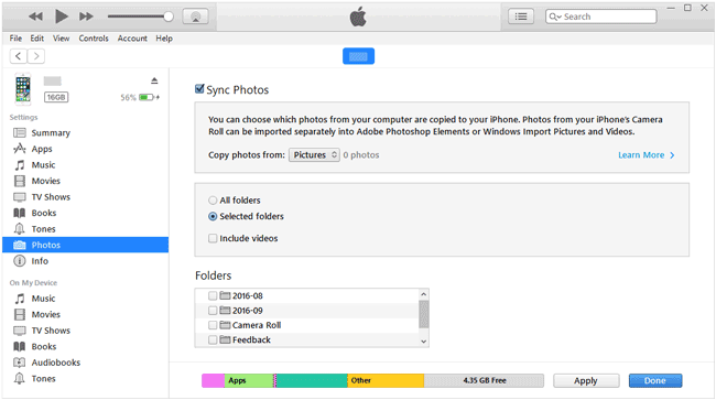 步骤 4. 勾选"同步照片",在"从......复制照片"旁边定义一个位置,并选中"包含视频"选项。