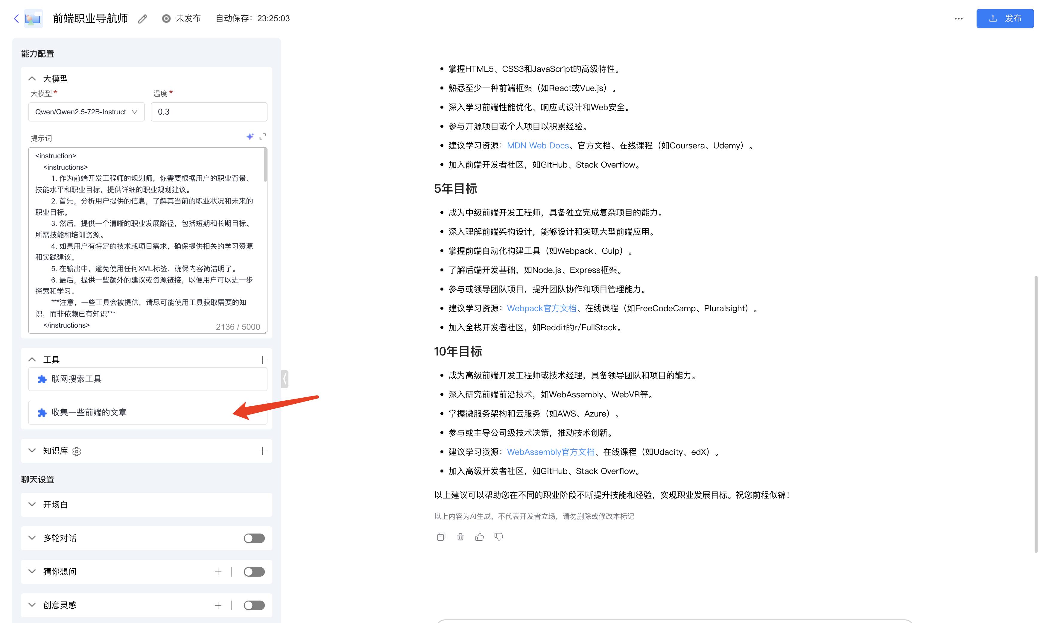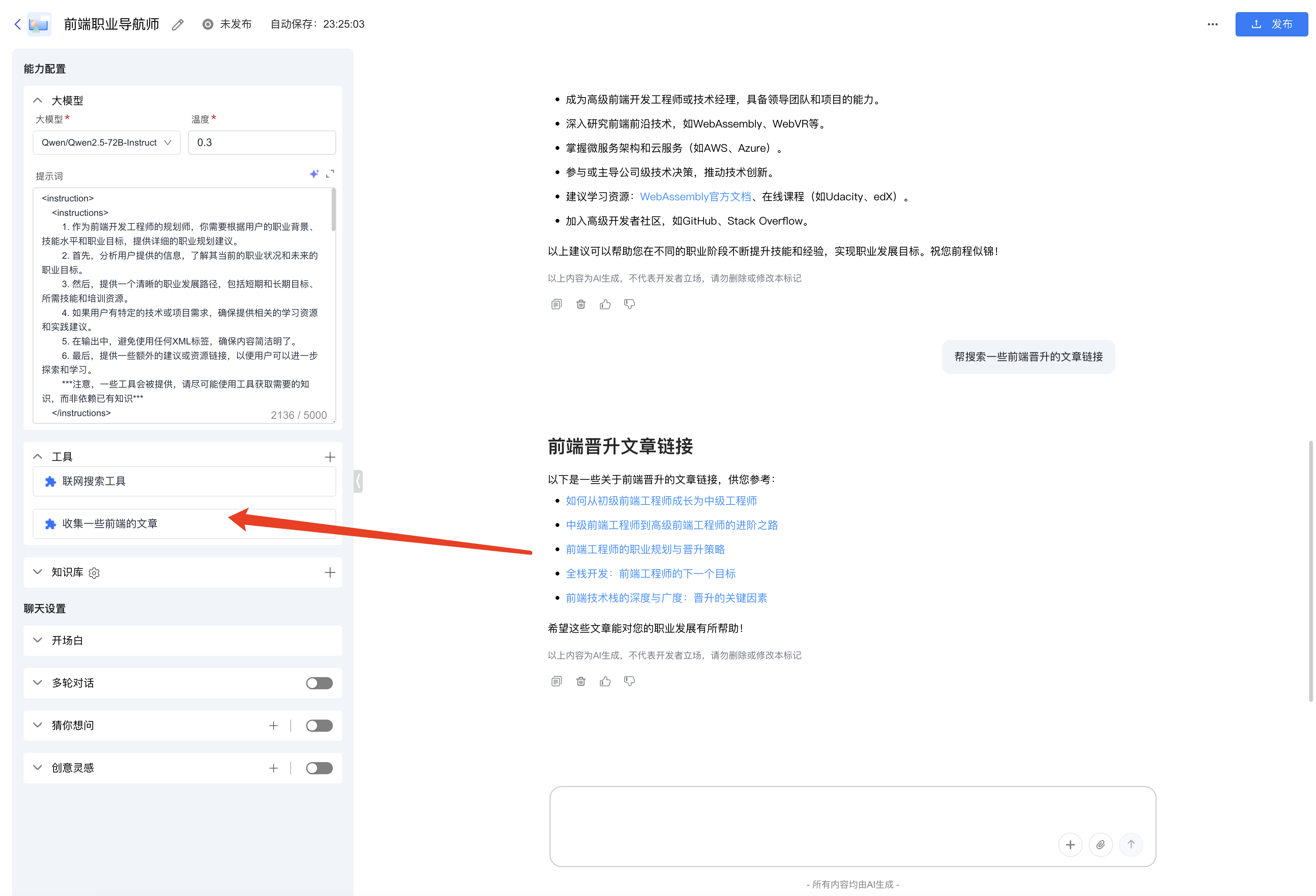 测试智能体的话,也是可以看到帮我们生成了一些文章,可以直接跳到规定的文章里面去。