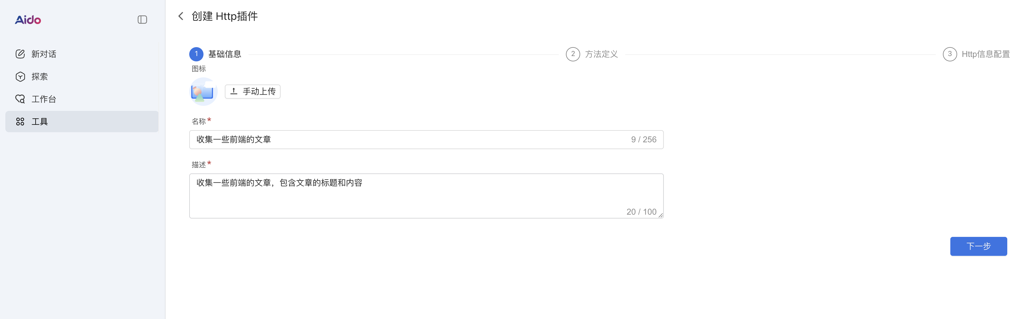 这里可以新建一个http插件,我们通过上传图片、名称、描述填写上。