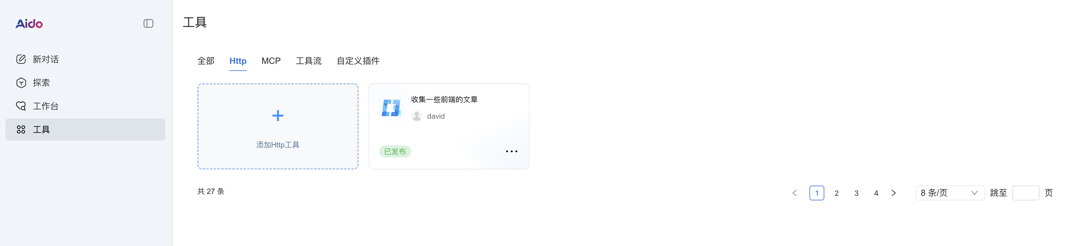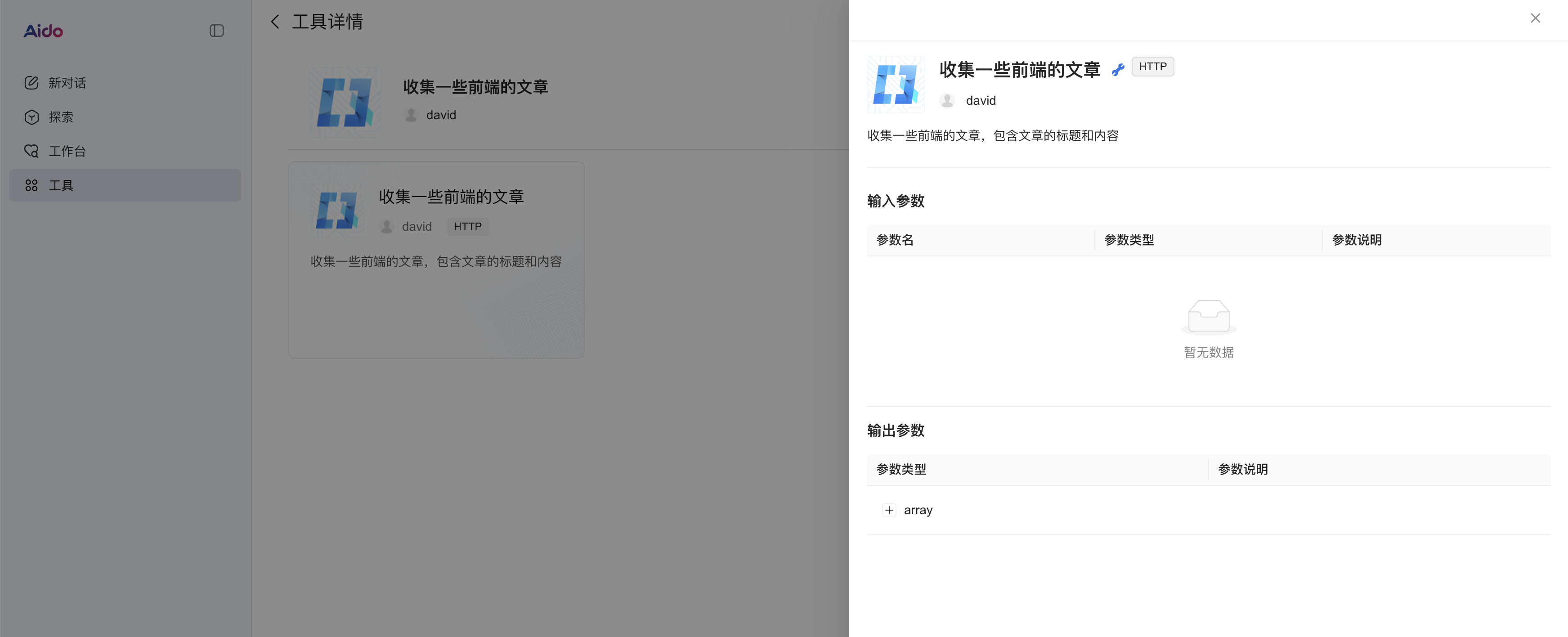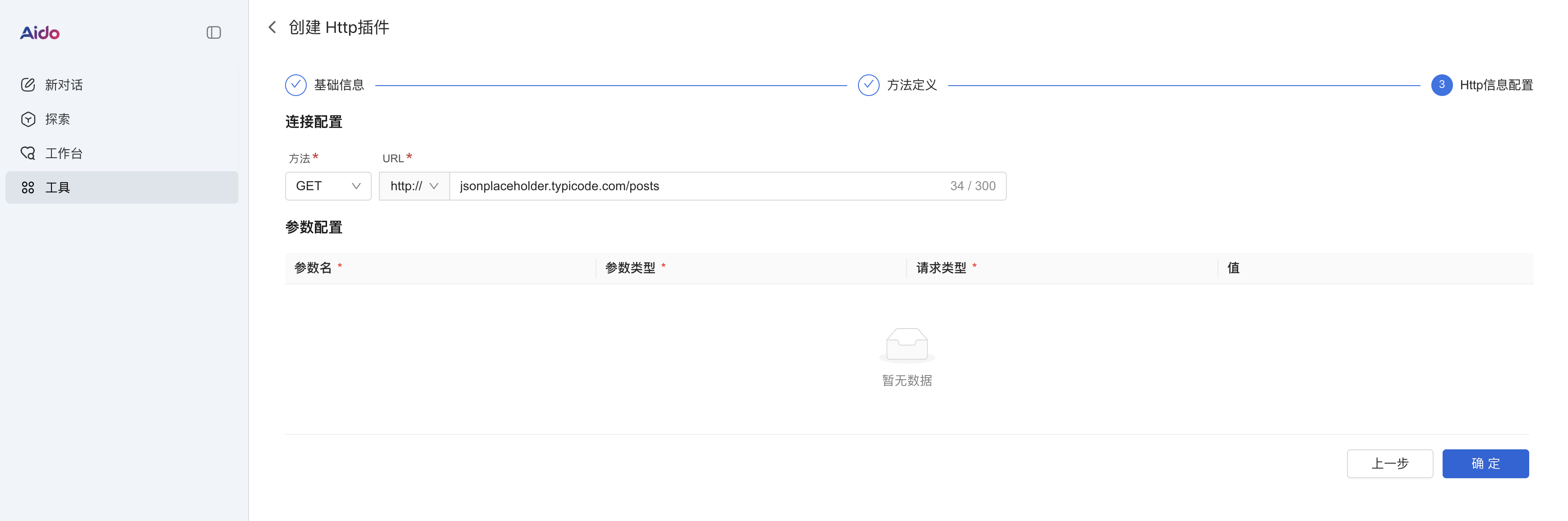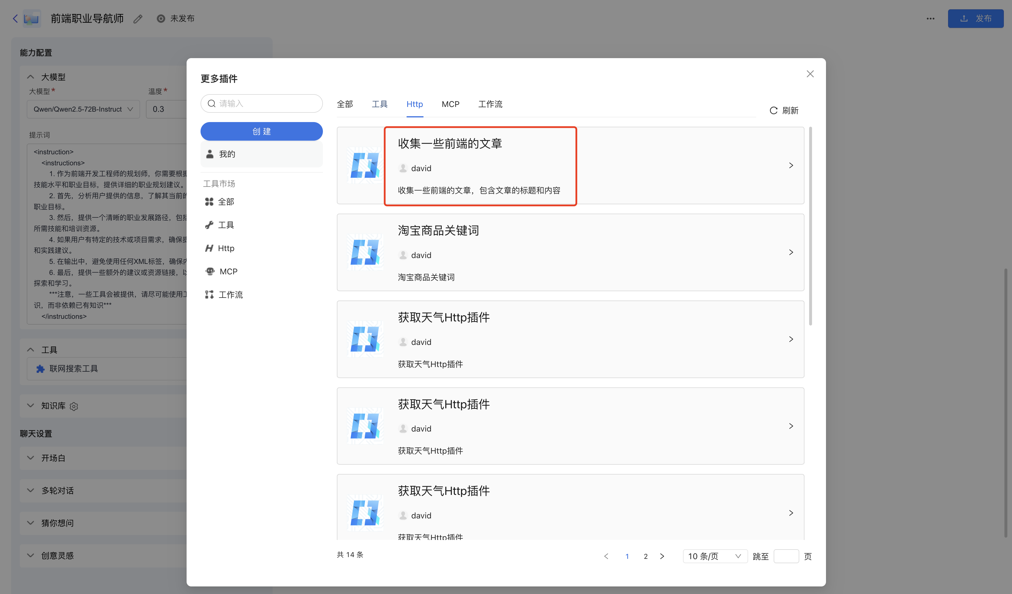 在上面确定完成后,我们可以看到这里就是新建了一个http插件成功了,我们就可以在智能体中进行使用了。