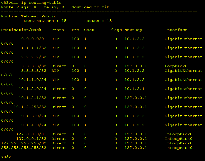 Huawei\]undo info-center ena Info: Information center is disabled. \[Huawei\]sysn R3 \[R3\]int l0 \[R3-LoopBack0\]ip add 3.3.3.3 32 \[R3-LoopBack0\]int g0/0/0 \[R3-GigabitEthernet0/0/0\]ip add 10.1.2.1 24 \[R3-GigabitEthernet0/0/0\]qu \[R3