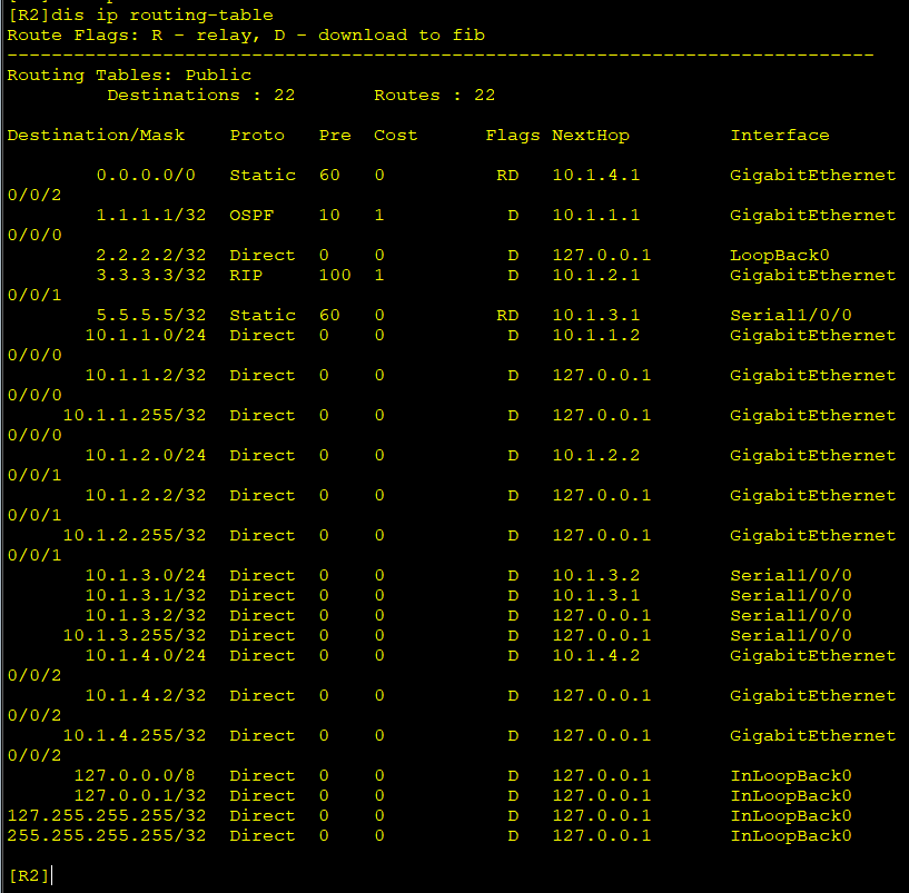 Huawei\]undo info-center ena Info: Information center is disabled. \[Huawei\]sysn R2 \[R2\]int l0 \[R2-LoopBack0\]ip add 2.2.2.2 32 \[R2-LoopBack0\]int g0/0/0 \[R2-GigabitEthernet0/0/0\]ip add 10.1.1.2 24 \[R2-GigabitEthernet0/0/0\]int g0/0/1 \[R2-GigabitEthernet0/0/1\]ip add 10.1.2.2 24 \[R2-GigabitEthernet0/0/1\]int g0/0/2 \[R2-GigabitEthernet0/0/2\]ip add 10.1.4.2 24 \[R2-GigabitEthernet0/0/2\]int s1/0/0 \[R2-Serial1/0/0\]ip add 10.1.3.2 24 \[R2-Serial1/0/0\]qu \[R2