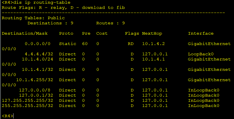 Huawei\]undo info-center ena Info: Information center is disabled. \[Huawei\]sysn R4 \[R4\]int l0 \[R4-LoopBack0\]ip add 4.4.4.4 32 \[R4-LoopBack0\]int g0/0/0 \[R4-GigabitEthernet0/0/0\]ip add 10.1.4.1 24 \[R4-GigabitEthernet0/0/0\]qu \[R4