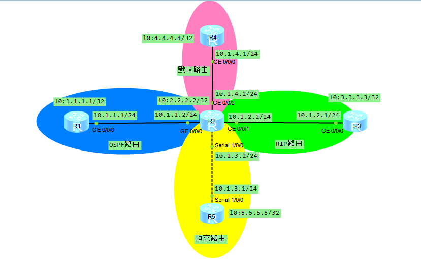 R2\]ospf 1 \[R2-ospf-1\]ar 0 \[R2-ospf-1-area-0.0.0.0\]network 2.2.2.2 0.0.0.0 \[R2-ospf-1-area-0.0.0.0\]network 10.1.1.0 0.0.0.255 \[R2-ospf-1-area-0.0.0.0\]qu \[R2-ospf-1\]qu \[R2\]rip 1 \[R2-rip-1\]ver 2 \[R2-rip-1\]netw \[R2-rip-1\]network 10.0.0.0 \[R2-rip-1\]qu \[R2\]ip route-static 5.5.5.5 32 10.1.3.1 \[R2\]ip route-static 0.0.0.0 0 10.1.4.1 R3: \[R3\]rip 1 \[R3-rip-1\]ver 2 \[R3-rip-1\]network 3.0.0.0 \[R3-rip-1\]network 10.0.0.0 \[R3-rip-1\]qu \[R3