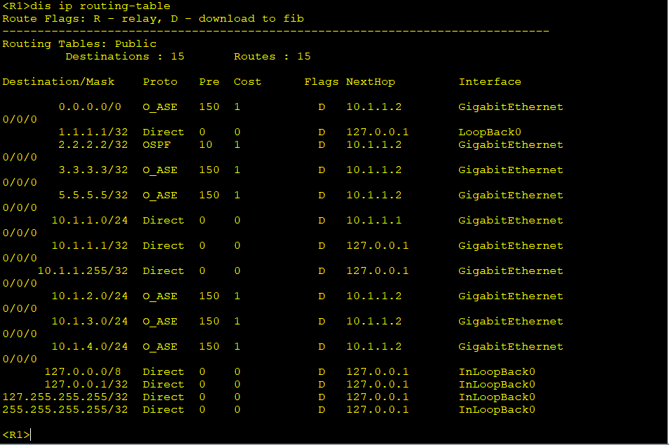 R1\]ospf 1 \[R1-ospf-1\]ar 0 \[R1-ospf-1-area-0.0.0.0\]net \[R1-ospf-1-area-0.0.0.0\]network 1.1.1.1 0.0.0.0 \[R1-ospf-1-area-0.0.0.0\]net \[R1-ospf-1-area-0.0.0.0\]network 10.1.1.0 0.0.0.255 \[R1-ospf-1-area-0.0.0.0\]qu \[R1-ospf-1