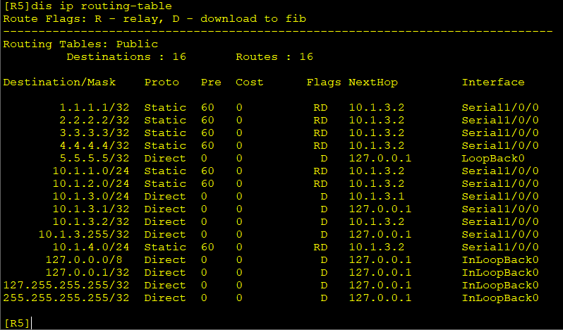 R4\]ip route-static 0.0.0.0 0 10.1.4.2 R5: \[R5\]ip route-s \[R5\]ip route-static 1.1.1.1 32 10.1.3.2 \[R5\]ip route-static 2.2.2.2 32 10.1.3.2 \[R5\]ip route-static 3.3.3.3 32 10.1.3.2 \[R5\]ip route-static 4.4.4.4 32 10.1.3.2 \[R5\]ip route-static 5.5.5.5 32 10.1.3.2 \[R5\]ip route-static 10.1.1.0 24 10.1.3.2 \[R5\]ip route-static 10.1.2.0 24 10.1.3.2 \[R5\]ip route-static 10.1.4.0 24 10.1.3.2 \[R5
