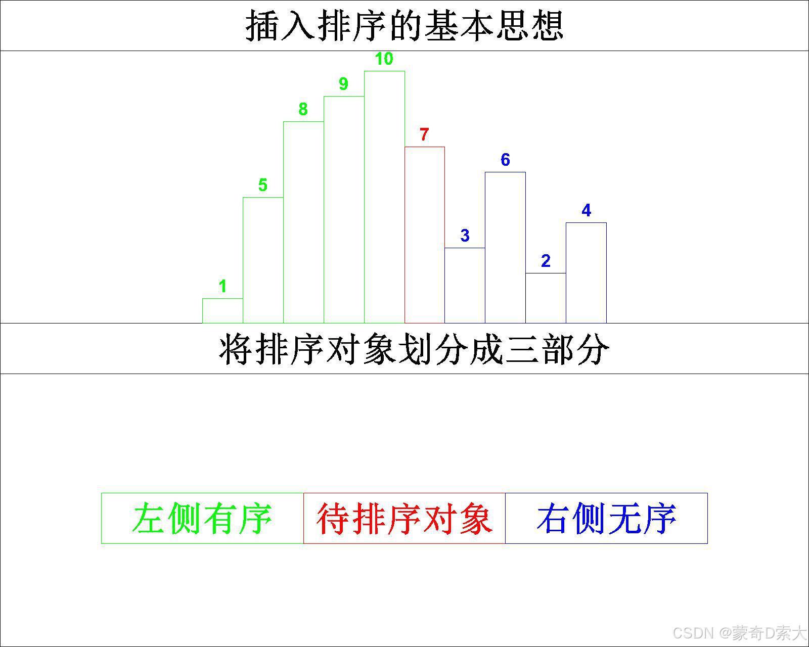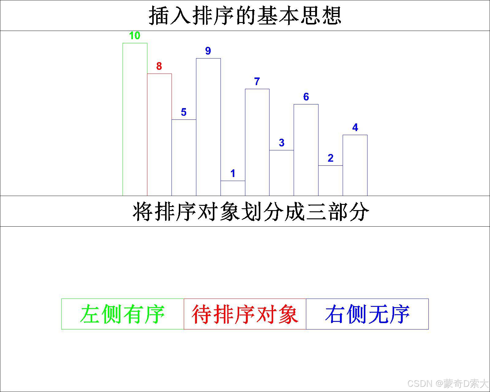- 将排序对象划分成三部分------左侧有序数据、待排序对象以及右侧无序数据。