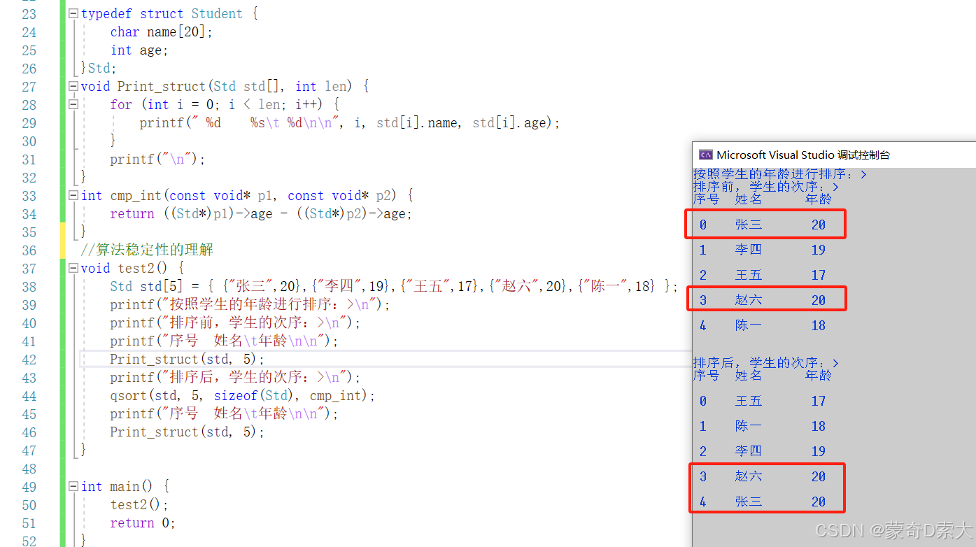 在这个例子中,我们通过按照年龄给 5 5 5 名学生进行排名,可以看到年龄同为 20 20 20 的张三和赵六,在排序前,张三的位置是在赵六的前面,但是经过排序后,张三则被排到了赵六的后面。