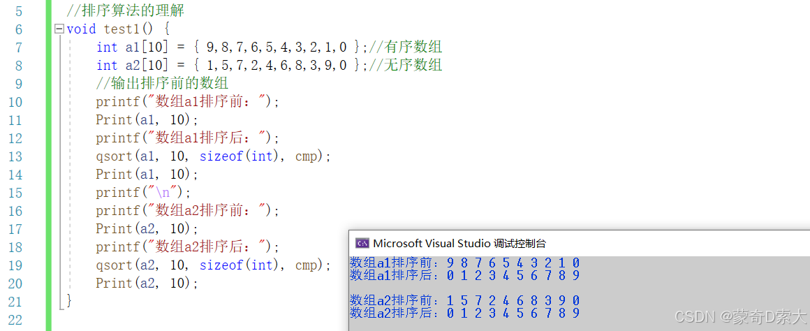 这里我们通过对 有序的数组 a1 与 无序数组 a2 通过 qsort 库函数来进行 升序排序 。从输出的结果可以看到,经过 排序 后的数组中的元素都按照要求在数组中完成了 升序排列 。同理,我们同样可以将数组完成 降序排序 ,具体的排序方式,则需要我们根据具体的情况进行选择。