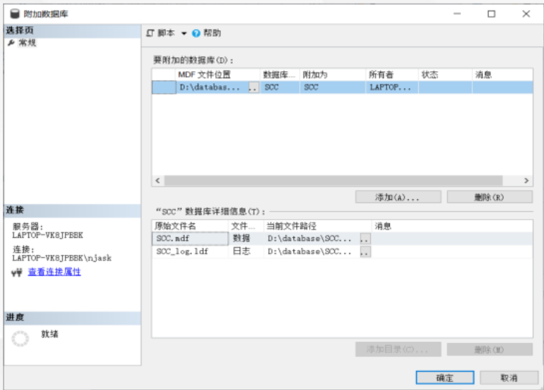 - 在弹出的 "附加数据库" 窗口中,单击 "添加" 按钮,弹出 "定位数据库文件" 窗口,选择要附加的数据库文件 "SCC.mdf",然后单击 "确定" 按钮即可完成数据库的附加操作。